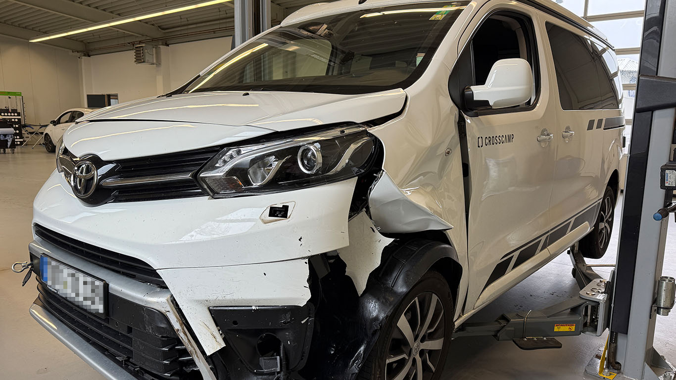 Frontschaden an weißem Toyota-Camper nach Verkehrsunfall – wirtschaftlicher Totalschaden